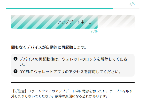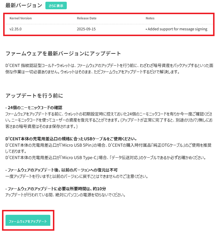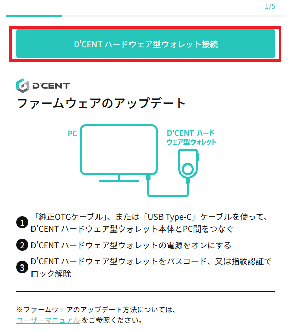 D'CENTのホームページ(https://userguide.dcentwallet.com/v/japanese/biometric-wallet/firmware-update)にも手順は説明されていますが、本記事ではどなたでも迷わずに実施できるように解説したいと思いますので、どうぞお役立てください。