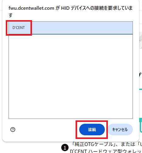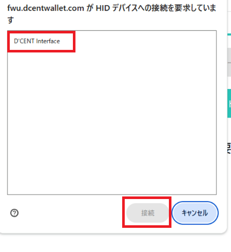 ウォレットの電源を入れると表示される「D’CENT」を選択し、「接続」をクリック