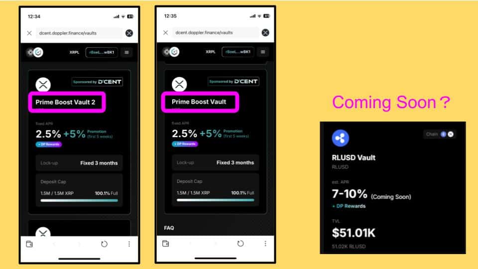 以下「Prime Boost Vault」が確認できます。2つとも上限に達しているのが確認できますが、3つ目、4つ目が出ることもあります。(本命は、Rippleステーブルコイン「RLUSD」のVault。利回りは7~10%)