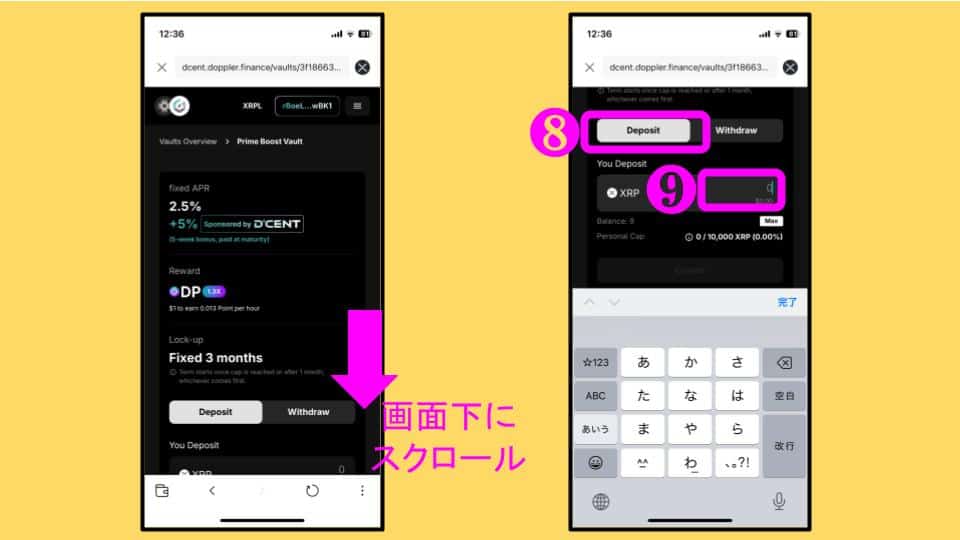 画面を下にスクロールさせ、❽「Deposit」を選んでいることを確認し、❾の箇所に預け入れたいXRPの数量を入力する。その後、承認作業(Approve)を行って預け入れは完了です。