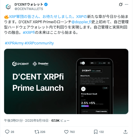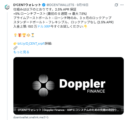 2025年8月にオープンしたDoppler Financeですが、その後、9月19日にD’CENTから以下のお知らせがありました。