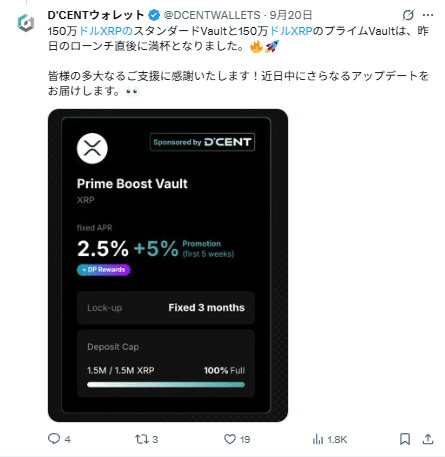 ただし、2025年10月12日現在、Vaultは受け入れ資金が上限に達している状況が続いています。